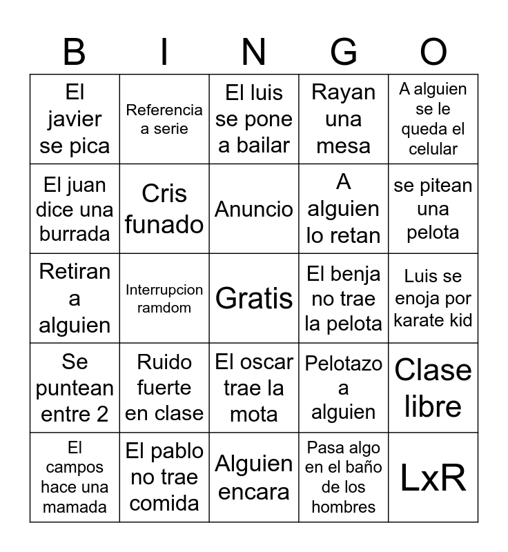 This bingo card has a free space and 29 words: El campos hace una mamada, Bomba fetida, Interrupcion ramdom, Alguien se cae, El javier se pica, El luis se pone a bailar, Cris funado, Ruido fuerte en clase, El benja no trae la pelota, El pablo no trae comida, Luis se enoja por karate kid, LxR, Alguien encara, Pasa algo en el baño de los hombres, se pitean una pelota, Pelea, El oscar trae la mota, Se puntean entre 2, A alguien se le queda el celular, Retiran a alguien, Pelotazo a alguien, La 33 se acerca, A alguien lo retan, El juan dice una burrada, Rayan una mesa, Referencia a serie, Clase libre, Anuncio and Niños en las ventanas.
