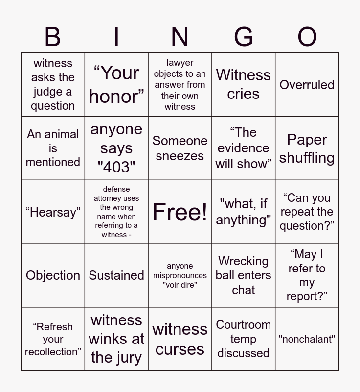 This bingo card has a free space and 30 words: witness winks at the jury, defense attorney mispronounces a witness' name, defense attorney uses the wrong name when referring to a witness -, witness asks the lawyer a question, witness asks the judge a question, lawyer objects to an answer from their own witness, anyone says "403", anyone mispronounces "voir dire", "what, if anything", witness curses, “Can you repeat the question?”, "nonchalant", Courtroom temp discussed, Live plant in court, Paper shuffling, Troll enters chat, Wrecking ball enters chat, Objection, Sustained, Overruled, “Hearsay”, “Was that a yes?”, “Your honor”, “The evidence will show”, An animal is mentioned, Witness cries, “May I refer to my report?”, “Refresh your recollection”, Someone sneezes and “Hearsay”.