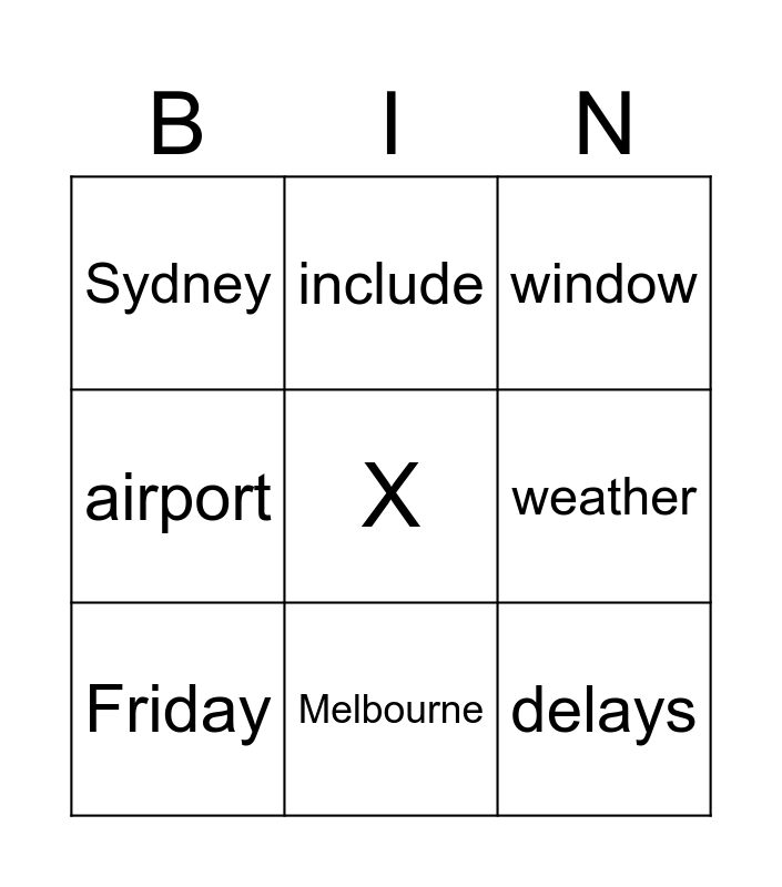 This bingo card has a free space and 10 words: Melbourne, window, Sydney, delays, airport, Friday, include, flight, weather and possible.