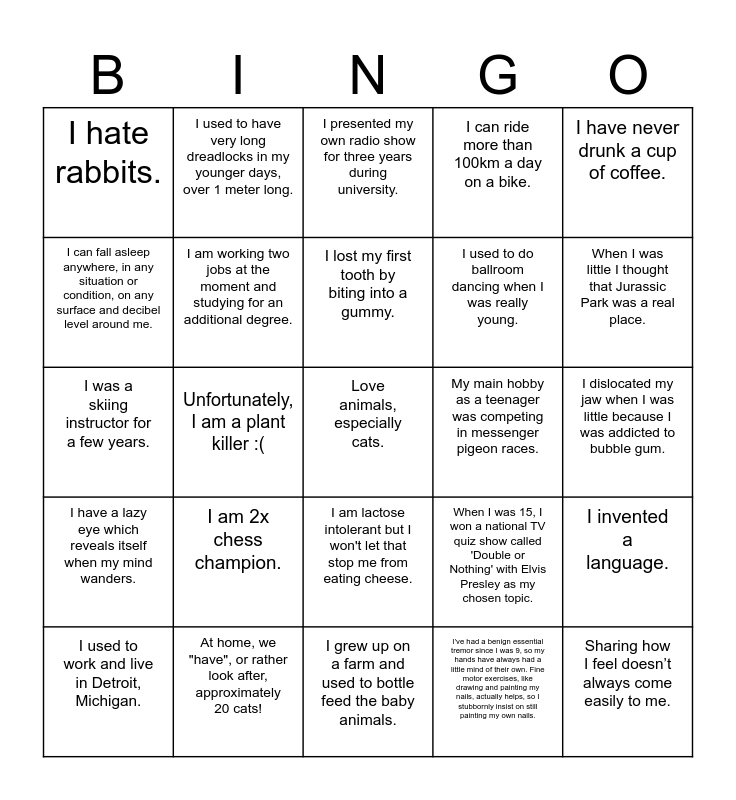 This bingo card has a free space and 24 words: I am 2x chess champion., At home, we "have", or rather look after, approximately 20 cats!, I lost my first tooth by biting into a gummy., I used to work and live in Detroit, Michigan., I have never drunk a cup of coffee., I hate rabbits., I can fall asleep anywhere, in any situation or condition, on any surface and decibel level around me., I used to have very long dreadlocks in my younger days, over 1 meter long., My main hobby as a teenager was competing in messenger pigeon races., I am lactose intolerant but I won't let that stop me from eating cheese., I used to do ballroom dancing when I was really young., I was a skiing instructor for a few years., When I was 15, I won a national TV quiz show called 'Double or Nothing' with Elvis Presley as my chosen topic., I invented a language., I am working two jobs at the moment and studying for an additional degree., I’ve had a benign essential tremor since I was 9, so my hands have always had a little mind of their own. Fine motor exercises, like drawing and painting my nails, actually helps, so I stubbornly insist on still painting my own nails., I dislocated my jaw when I was little because I was addicted to bubble gum., I presented my own radio show for three years during university., When I was little I thought that Jurassic Park was a real place., Unfortunately, I am a plant killer :(, Sharing how I feel doesn’t always come easily to me., I have a lazy eye which reveals itself when my mind wanders., I can ride more than 100km a day on a bike. and I grew up on a farm and used to bottle feed the baby animals..