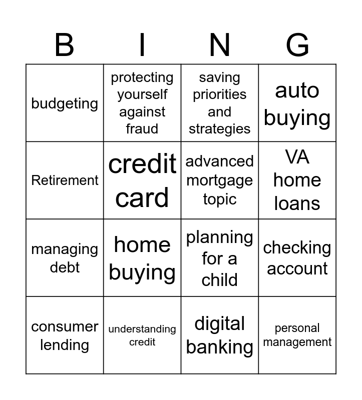 This bingo card has 16 words: understanding credit, checking account, saving priorities and strategies, budgeting, managing debt, protecting yourself against fraud, planning for a child, digital banking, Retirement, credit card, consumer lending, auto buying, home buying, VA home loans, advanced mortgage topic and personal management.