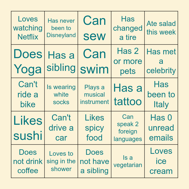 This bingo card has 25 words: Can't drive a car, Does not have a sibling, Can swim, Does not drink coffee, Ate salad this week, Loves watching Netflix, Does Yoga, Has never been to Disneyland, Has a tattoo, Likes spicy food, Has 2 or more pets, Can't ride a bike, Can speak 2 foreign languages, Has 0 unread emails, Has a sibling, Loves ice cream, Has been to Italy, Can sew, Has met a celebrity, Is wearing white socks, Plays a musical instrument, Loves to sing in the shower, Likes sushi, Has changed a tire and Is a vegetarian.