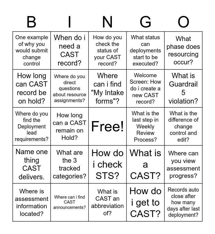 This bingo card has a free space and 24 words: What are the 3 tracked categories?, Where can i find CAST announcements?, Where can i find "My Intake forms"?, Where is assessment information located?, What phase does resourcing occur?, One example of why you would submit change control, How long can CAST record be on hold?, When do i need a CAST record?, What is the last step in Weekly Review Process?, How do i check STS?, Welcome Screen: How do i create a new CAST record?, Where do you find the Deployment lead requirements?, What is a CAST?, Where can you view assessment progress?, Where do you direct questions about resource assignments?, How do i get to CAST?, What is the difference of change control and edit?, How do you check the status of your CAST record?, What is Guardrail 5 violation?, How long can a CAST remain on Hold?, Records auto close after how many days after last deployment?, Name one thing CAST delivers., What status can deployments start to be executed? and What is CAST an abbreviation of?.