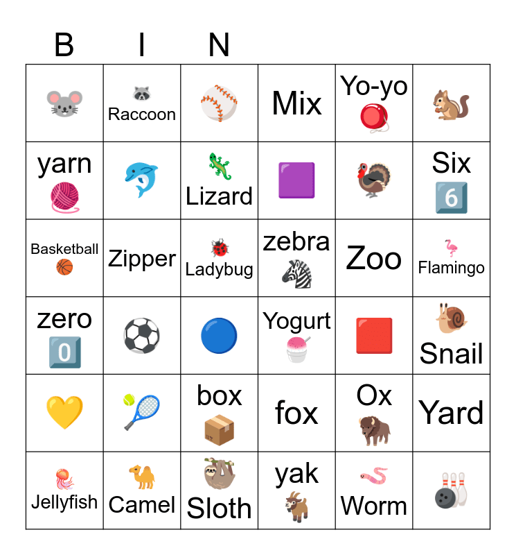 This bingo card has 36 words: fox, box πŸ“¦, yak 🐐, yarn🧢, zero 0️⃣, zebra πŸ¦“, 🐬, πŸ¦₯ Sloth, Yo-yo πŸͺ€, Ox 🦬, Six 6️⃣, Mix, Yard, Zipper, πŸŸͺ, 🐭, πŸ’›, Zoo, BasketballπŸ€, ⚾️, 🐞 Ladybug, ⚽️, Yogurt 🍧, πŸ”΅, πŸŸ₯, 🦝 Raccoon, πŸ¦ƒ, πŸͺ Camel, 🦎 Lizard, 🐿, 🎳, πŸͺΌ Jellyfish, 🐌 Snail, 🦩 Flamingo, 🎾 and πŸͺ± Worm.