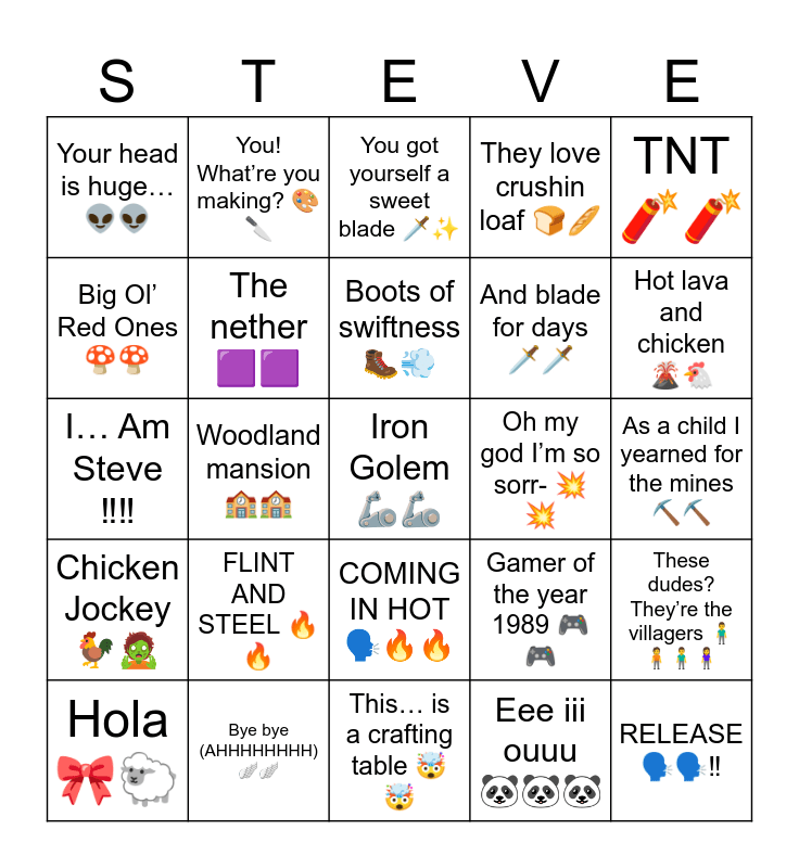 This bingo card has 30 words: Bye bye (AHHHHHHHH) ๐ชฝ๐ชฝ, Welcome to the stash ๐โจ, Woodland mansion ๐ซ๐ซ, Diamond Armor (full set) ๐๐, Your head is hugeโฆ ๐ฝ๐ฝ, You got yourself a sweet blade ๐ก๏ธโจ, The nether ๐ช๐ช, COMING IN HOT ๐ฃ๏ธ๐ฅ๐ฅ, Oh my god Iโm so sorr- ๐ฅ๐ฅ, Thisโฆ is a crafting table ๐คฏ๐คฏ, As a child I yearned for the mines โ๏ธโ๏ธ, Iron Golem ๐ฆพ๐ฆพ, Eee iii ouuu ๐ผ๐ผ๐ผ, RELEASE ๐ฃ๏ธ๐ฃ๏ธโผ๏ธ, Hot lava and chicken ๐๐, PINK HOUSE ๐๐ก, Gamer of the year 1989 ๐ฎ๐ฎ, Chicken Jockey ๐๐ง, FLINT AND STEEL ๐ฅ๐ฅ, TNT๐งจ๐งจ, Iโฆ Am Steve โผ๏ธโผ๏ธ, KADOOSH ๐ชฃ๐ชฃ, You! Whatโre you making? ๐จ๐ช, And blade for days ๐ก๏ธ๐ก๏ธ, Big Olโ Red Ones ๐๐, They love crushin loaf ๐๐ฅ, These dudes? Theyโre the villagers ๐งโโ๏ธ๐ง๐งโโ๏ธ๐งโโ๏ธ, Hola ๐๐, Boots of swiftness ๐ฅพ๐จ and An ender Pearl ๐ฎ๐ฎ.