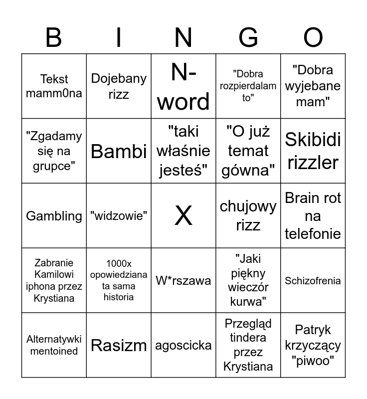 This bingo card has a free space and 52 words: Temat gówna, Patryk krzyczący "piwoo", "prawiczki", agoscicka, 1000x opowiedziana ta sama historia, "sigmaa", Dojebany rizz, Temat samobójstwa, "Zgadamy się na grupce", pwsz mentoined, Bambi, Kamil krzyczący "ESSA", Schizofrenia, "Jaki piękny wieczór kurwa", Tekst dawida jaspera, @napewnonieswat, "taki właśnie jesteś", chujowy rizz, grożenie śmiercią drugiej osobie (nic nie robi), "Dobra wyjebane mam", "widzowie", Przegląd tindera przez Krystiana, Tekst mamm0na, "O już temat gówna", Ferrari, Hiundaj, Chivas, "Ale ma gyata", Skibidi rizzler, "Ale ona ma talent", "Wspaniały artysta", "Dobra rozpierdalam to", "W płocku nic nie ma", KingStar mentoined, Grożenie wysadzenia bomby, N-word, Rasizm, JP [...], "Ale to pierdolnięte jest", out of context darcie pizdy, Iga Świątek, Brain rot na telefonie, Zabranie Kamilowi iphona przez Krystiana, "Nie wygodnie mi się...", W*rszawa, "Ale zapierdol w tej robocie", Gejowanie, Gambling, psychicznie chory, Pedofilia, Alternatywki mentoined and Temat stup.