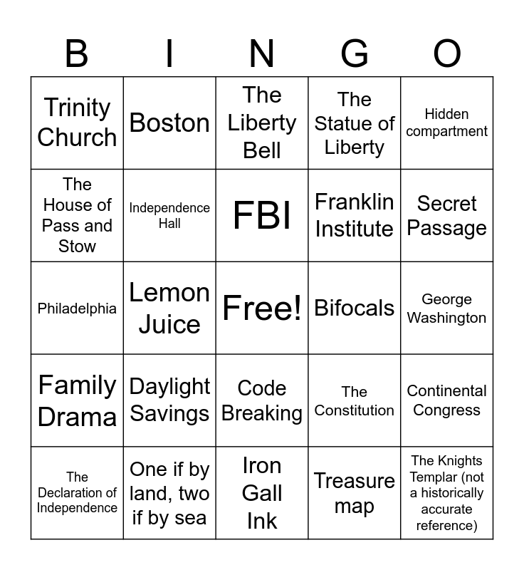 This bingo card has a free space and 29 words: The Declaration of Independence, Silence Dogood, Lemon Juice, The Free Mason Symbol, Trinity Church, The Liberty Bell, Independence Hall, Daylight Savings, Bifocals, One if by land, two if by sea, George Washington, The Knights Templar (not a historically accurate reference), Iron Gall Ink, Treasure map, Secret Passage, 2:22, Code Breaking, Family Drama, Hidden compartment, Philadelphia, The Constitution, 1776, Franklin Institute, The House of Pass and Stow, The Statue of Liberty, Boston, Continental Congress, FBI and $100.