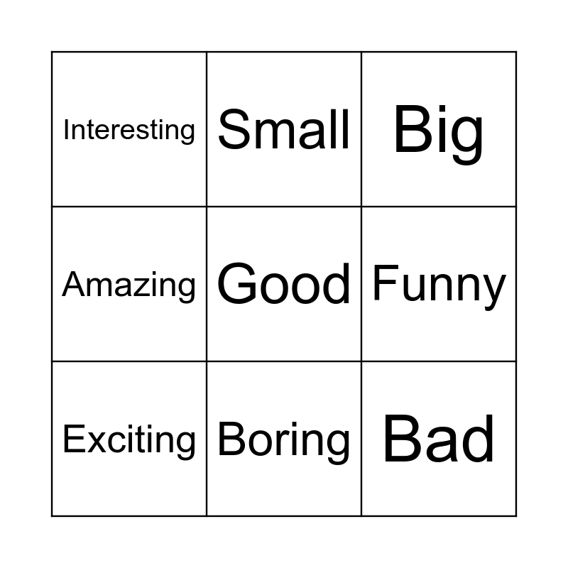 This bingo card has a free space and 8 words: Funny, Big, Small, Exciting, Interesting, Bad, Amazing and Boring.
