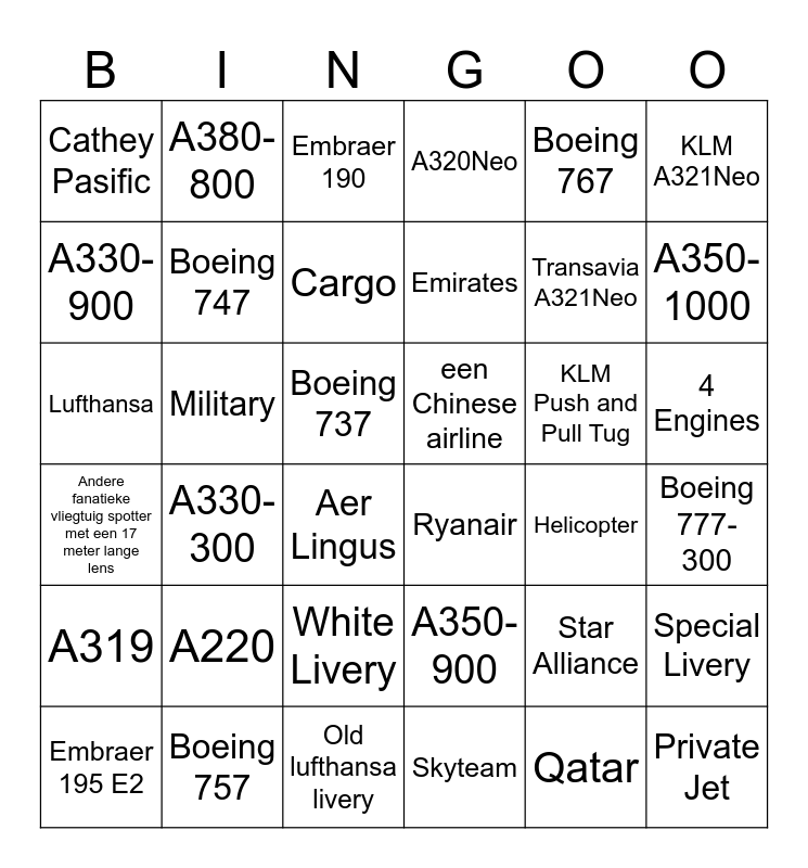 This bingo card has 36 words: A350-900, White Livery, Skyteam, A330-900, Andere fanatieke vliegtuig spotter met een 17 meter lange lens, een Chinese airline, Boeing 747, Old lufthansa livery, Boeing 767, Star Alliance, A350-1000, A320Neo, Special Livery, Military, Emirates, Cathey Pasific, A319, KLM Push and Pull Tug, Lufthansa, Embraer 190, Boeing 737, A330-300, Ryanair, Aer Lingus, Helicopter, A380-800, Transavia A321Neo, Boeing 757, Cargo, KLM A321Neo, Private Jet, Embraer 195 E2, Boeing 777-300, 4 Engines, A220 and Qatar.