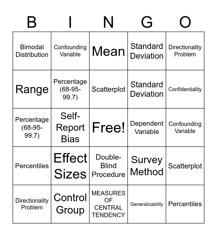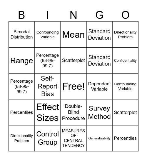 This bingo card has a free space and 123 words: Independent Variable, Case Study, Confederates, Dependent Variable, Naturalistic Observation, Debriefing, Confounding Variable, Correlation/Causation, MEASURES OF CENTRAL TENDENCY, Sampling Bias, Positive Correlation, Mean, Convenience Sample, Negative Correlation, Median, Random Sample, Directionality Problem, Mode, Random Assignment, Third-Variable Problem, Generalizability, Scatterplot, Range, Experimental Group, Correlation Coefficient, Standard Deviation, Control Group, Quantitative Measures, Normal Curve, Placebo Group, Likert Scale, Percentage (68-95-99.7), Percentiles, Placebo Effect, Qualitative Measure, Positive Skew, Single-Blind Procedure, Structured Interviews, Negative Skew, Double-Blind Procedure, Survey Method, Bimodal Distribution, Experimenter Bias, Framing, Regression toward the mean, Self-Report Bias, Statistical Significance, Social Desirability Bias, Institutional Review Board (IRB - for humans and animals), Effect Sizes, Operational Definition, Replication, Informed Consent, Hypothesis, Informed Assent, Confirmation Bias, Falsifiability, Protection from Harm, Overconfidence Bias, Meta-Analysis, Confidentiality, Hindsight Bias, Independent Variable, Case Study, Confederates, Dependent Variable, Naturalistic Observation, Debriefing, Confounding Variable, Correlation/Causation, Sampling Bias, Positive Correlation, Mean, Convenience Sample, Negative Correlation, Median, Random Sample, Directionality Problem, Mode, Random Assignment, Third-Variable Problem, Generalizability, Scatterplot, Range, Experimental Group, Correlation Coefficient, Standard Deviation, Control Group, Quantitative Measures, Normal Curve, Placebo Group, Likert Scale, Percentage (68-95-99.7), Percentiles, Placebo Effect, Qualitative Measure, Positive Skew, Single-Blind Procedure, Structured Interviews, Negative Skew, Double-Blind Procedure, Survey Method, Bimodal Distribution, Experimenter Bias, Framing, Regression toward the mean, Self-Report Bias, Statistical Significance, Social Desirability Bias, Institutional Review Board (IRB - for humans and animals), Effect Sizes, Operational Definition, Replication, Informed Consent, Hypothesis, Informed Assent, Confirmation Bias, Falsifiability, Protection from Harm, Overconfidence Bias, Meta-Analysis, Confidentiality and Hindsight Bias.