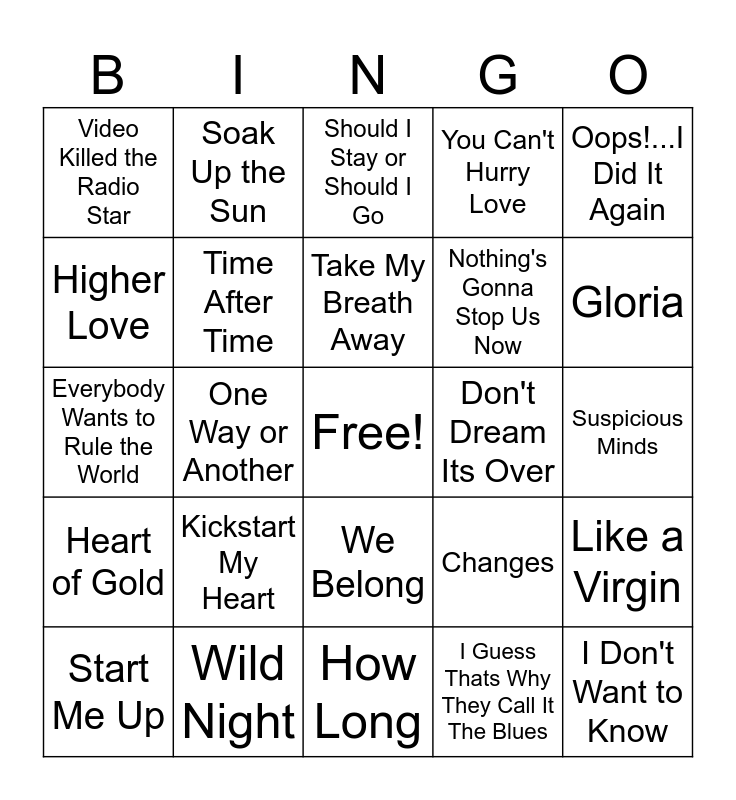 This bingo card has a free space and 31 words: How Long, Ramblin' Man, One Way or Another, Neon Moon, Video Killed the Radio Star, Should I Stay or Should I Go, Time After Time, Changes, Don't Dream Its Over, I Guess Thats Why They Call It The Blues, Suspicious Minds, I Don't Want to Know, Jack & Diane, Get Down On It, Gloria, Good Golly Miss Molly, Like a Virgin, Kickstart My Heart, Heart of Gold, We Belong, Oops!...I Did It Again, Blitzkrieg Bop, Start Me Up, Soak Up the Sun, Nothing's Gonna Stop Us Now, Higher Love, You Can't Hurry Love, Everybody Wants to Rule the World, Wild Night, Take My Breath Away and Wake Me Up Before You Go-Go.