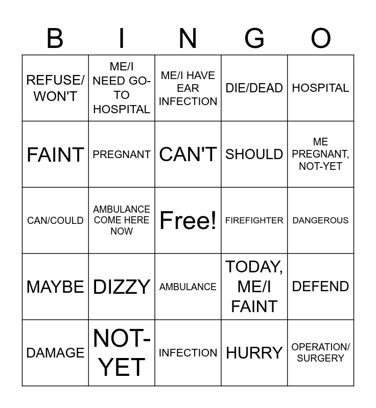 This bingo card has a free space and 29 words: DAMAGE, MUST, AMBULANCE COME HERE NOW, ALIVE, REFUSE/ WON'T, ME/I HAVE EAR INFECTION, PREGNANT, DIZZY, FIREFIGHTER, NOT-YET, DANGEROUS, OPERATION/ SURGERY, INFECTION, HURRY, ME PREGNANT, NOT-YET, WARNING, AMBULANCE, MAYBE, HOSPITAL, CAN/COULD, TODAY, ME/I FAINT, BLOOD, SHOULD, FAINT, DIE/DEAD, ME/I NEED GO-TO HOSPITAL, DEFEND, CAN'T and POLICE OFFICER.