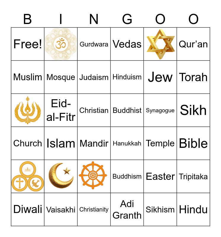 This bingo card has 6 images and 30 words: Buddhism, Adi Granth, Muslim, Church, Buddhist, Mosque, Christianity, Easter, Torah, Vedas, Tripitaka, Eid-al-Fitr, Hinduism, Free!, Synagogue, Gurdwara, Christian, Islam, Hanukkah, Mandir, Temple, Jew, Vaisakhi, Judaism, Qur’an, Hindu, Diwali, Bible, Sikh and Sikhism.