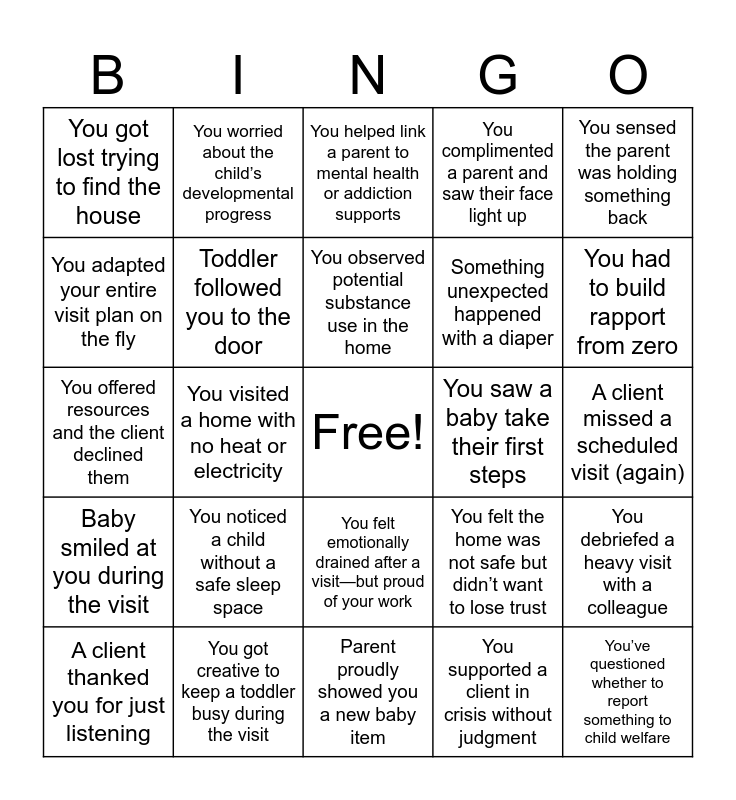 This bingo card has a free space and 42 words: You supported a parent showing signs of postpartum depression, You observed potential substance use in the home, You witnessed or heard signs of possible IPV (intimate partner violence), You noticed a child without a safe sleep space, You supported a client in crisis without judgment, You debriefed a heavy visit with a colleague, You’ve questioned whether to report something to child welfare, You kept your composure during a very tense visit, You helped link a parent to mental health or addiction supports, You felt emotionally drained after a visit—but proud of your work, A client missed a scheduled visit (again), You had to build rapport from zero, You visited a home with no heat or electricity, You sensed the parent was holding something back, A young parent was clearly overwhelmed, You felt the home was not safe but didn’t want to lose trust, You had to call your supervisor after a visit, You offered resources and the client declined them, You had to stay neutral during a heated conversation, You worried about the child’s developmental progress, You adapted your entire visit plan on the fly, You practiced harm reduction during the visit, You got barked at by a dog, You got lost trying to find the house, You were stuck in traffic between visits, You got caught in the rain running to the door, Something unexpected happened with a diaper, You knocked and someone yelled, “It’s open!” but it wasn’t, A client asked if you were a doctor, You’ve said, “Let’s just sit on the floor” more than once, Your visit was delayed by a very enthusiastic toddler story, Baby smiled at you during the visit, Toddler followed you to the door, Parent proudly showed you a new baby item, You were offered food or drink by a client, A client thanked you for just listening, You got creative to keep a toddler busy during the visit, You saw a baby take their first steps, You had to sing or dance to engage the child, A sibling tried to "help" with the visit, You complimented a parent and saw their face light up and Parent said, “I didn’t know that—thank you!”.