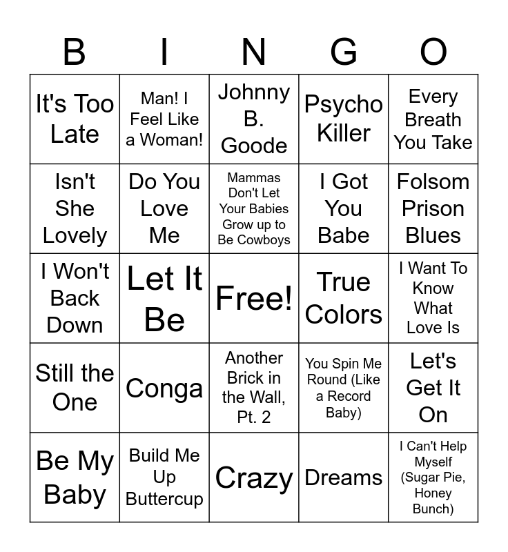 This bingo card has a free space and 31 words: Crazy, Venus, Let It Be, It's My Life, It's Too Late, Johnny B. Goode, Do You Love Me, You Spin Me Round (Like a Record Baby), True Colors, Dreams, I Want To Know What Love Is, I Can't Help Myself (Sugar Pie, Honey Bunch), She's Country, Rock and Roll All Nite, Folsom Prison Blues, The Girl Can't Help It, Let's Get It On, Conga, Still the One, Another Brick in the Wall, Pt. 2, Every Breath You Take, I like To Move It, Be My Baby, Man! I Feel Like a Woman!, I Got You Babe, Isn't She Lovely, Psycho Killer, I Won't Back Down, Build Me Up Buttercup, Mammas Don't Let Your Babies Grow up to Be Cowboys and I Wanna Dance With Somebody.