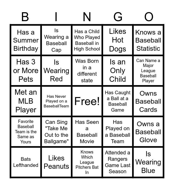 This bingo card has a free space and 24 words: Can Sing "Take Me Out to the Ballgame", Likes Peanuts, Was Born in a different state, Bats Lefthanded, Knows a Baseball Statistic, Has a Summer Birthday, Has 3 or More Pets, Is Wearing a Baseball Cap, Has Caught a Ball at a Baseball Game, Has Seen a Baseball Movie, Is an Only Child, Met an MLB Player, Has Played on a Baseball Team, Owns a Baseball Glove, Is Wearing Red, Attended a Rangers Game Last Season, Owns Baseball Cards, Has a Child Who Played Baseball in High School, Can Name a Major League Baseball Player, Has Never Played on a BaseballTeam, Is Wearing Blue, Favorite Baseball Team is the Same as Yours, Likes Hot Dogs and Knows Which League Pitchers Bat In.