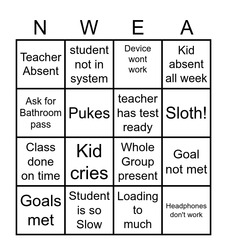 This bingo card has 18 words: Kid cries, Headphones don't work, Device wont work, Teacher Absent, Whole Group present, Kid absent all week, Goals met, student not in system, Sloth!, Class done on time, Loading to much, Ask for Bathroom pass, Goal not met, Pukes, teacher has test ready, Para absent, Student is so Slow and Teacher has no test.