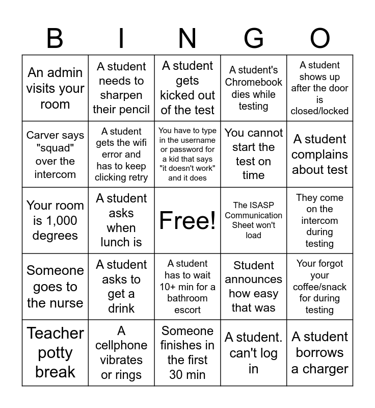 This bingo card has a free space and 43 words: A student (almost) falls asleep, A student borrows a charger, Student potty break, Teacher potty break, A student spills a drink, A student. can't log in, A student gets kicked out of the test, Carver says "Go J-Hawks!" over the intercom, A student shows up after the door is closed/locked, A cellphone vibrates or rings, A student's Chromebook dies while testing, The ISASP Communication Sheet won't load, A student has to wait 10+ min for a bathroom escort, A student asks to get a drink, A student asks to get their devices back early, Someone finishes in the first 30 min, Same student tries to leave more than once, Your room is 1,000 degrees, Your room is freezing, A student complains about test, A student needs to sharpen their pencil, A student blows their nose, A student coughs more than once, An admin visits your room, There is an all staff email about testing or attendance during the test window, They come on the intercom during testing, A student doodles on their testing ticket or scratch paper, A student uses an entire piece of scratch paper, Student announces how easy that was, Someone goes to the nurse, Your brought coffee and and/or a snack for during testing, Your forgot your coffee/snack for during testing, You wait for more than 10min for tech support, A student asks when lunch is, A student asks what class is next, A student complains about waiting from 8-8:15 for test to start, Student NEEDS water, You have to type in the username or password for a kid that says "it doesn't work" and it does, Carver says "squad" over the intercom, You cannot start the test on time, More than 2 students are absent, A student gets the wifi error and has to keep clicking retry and There are at least 3 energy drinks (hyper, alani, etc) being drunk.