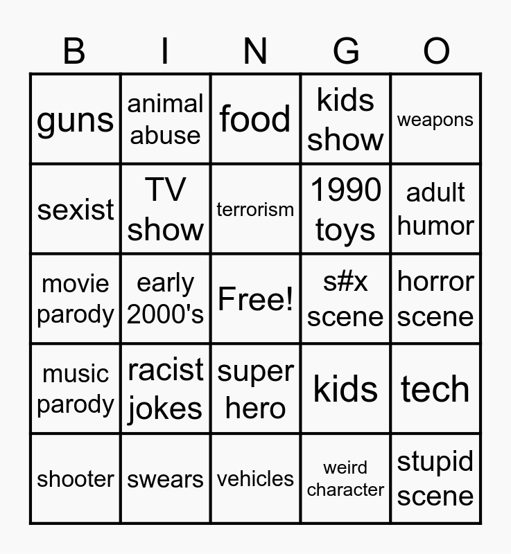 This bingo card has a free space and 24 words: racist jokes, swears, terrorism, shooter, weapons, guns, sexist, animal abuse, s#x scene, super hero, 1990 toys, movie parody, kids, tech, TV show, weird character, horror scene, food, adult humor, early 2000's, stupid scene, music parody, kids show and vehicles.