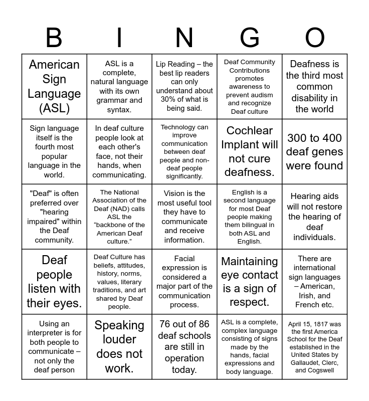 This bingo card has 35 words: The sign language used in the United States and Canada is not universal., Deaf people are statistically better drivers than drivers who can hear., Deaf people are more visually aware when they are driving than those who rely on sounds for cues., In deaf culture people look at each other's face, not their hands, when communicating., Facial expression is considered a major part of the communication process., Deaf Community Contributions promotes awareness to prevent audism and recognize Deaf culture, Sign language itself is the fourth most popular language in the world., American Sign Language were created by MVSL, Native Sign Language and FSL., Technology can improve communication between deaf people and non-deaf people significantly., 90% of all deaf people are born to hearing parents, most of them with no experience in deafness., "Deaf" is often preferred over "hearing impaired" within the Deaf community., Deafness is the third most common disability in the world, 69% of Deaf children live in homes where members do not use sign language regularly, Deaf people embrace their Deafness and are proud of their history., American Sign Language (ASL), English is a second language for most Deaf people making them bilingual in both ASL and English., ASL is a complete, complex language consisting of signs made by the hands, facial expressions and body language., The National Association of the Deaf (NAD) calls ASL the “backbone of the American Deaf culture.”, Deaf people listen with their eyes., Vision is the most useful tool they have to communicate and receive information., Maintaining eye contact is a sign of respect., Using an interpreter is for both people to communicate – not only the deaf person, There are international sign languages – American, Irish, and French etc., Speaking louder does not work., Lip Reading – the best lip readers can only understand about 30% of what is being said., 300 to 400 deaf genes were found, April 15, 1817 was the first America School for the Deaf established in the United States by Gallaudet, Clerc, and Cogswell, Flicking lights, waving hands, stomping on the floor, or tapping a shoulder are ways to get a deaf person's attention., Cochlear Implant will not cure deafness., Hearing aids will not restore the hearing of deaf individuals., CODA summary for child or children of deaf adults., 76 out of 86 deaf schools are still in operation today., Deaf Culture has beliefs, attitudes, history, norms, values, literary traditions, and art shared by Deaf people., ASL is a complete, natural language with its own grammar and syntax. and Facial Expression is part of language, not emotional indicators..
