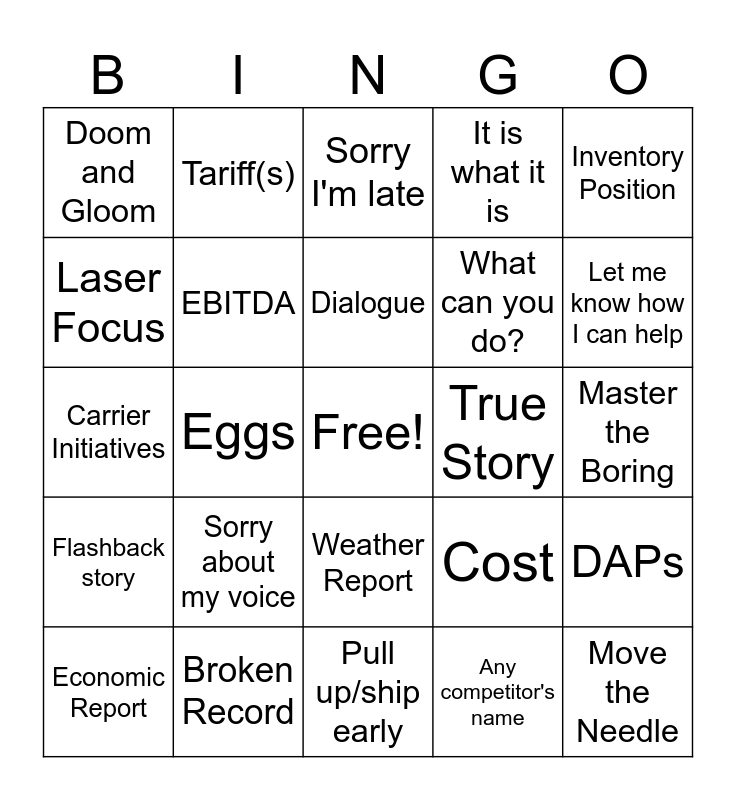 This bingo card has a free space and 34 words: Uncertainty, Fuel, Challenge, Fill up my personal vehicle, Master the Boring, Laser Focus, EBITDA, Pull up/ship early, What can you do?, Move the Needle, Carrier Initiatives, Tariff(s), Any competitor's name, Do Our Part, Flashback story, Eggs, Weather Report, True Story, DAPs, Economic Report, Broken Record, Margin Compression, It is what it is, Let me know how I can help, Any Questions, Sorry about my voice, Sorry I'm late, Risk, Inventory Position, Doom and Gloom, All Hands on deck, Dialogue, Cost and Geopolitical instability.