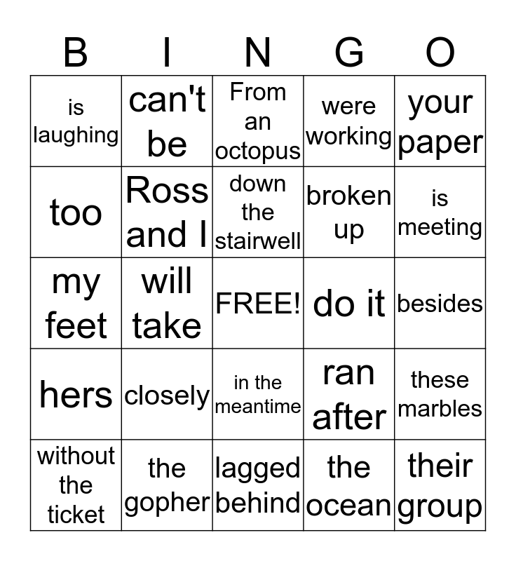 This bingo card has a free space and 24 words: closely, the gopher, down the stairwell, without the ticket, your paper, is laughing, too, can't be, do it, in the meantime, broken up, my feet, ran after, these marbles, Ross and I, the ocean, besides, From an octopus, is meeting, will take, their group, hers, were working and lagged behind.