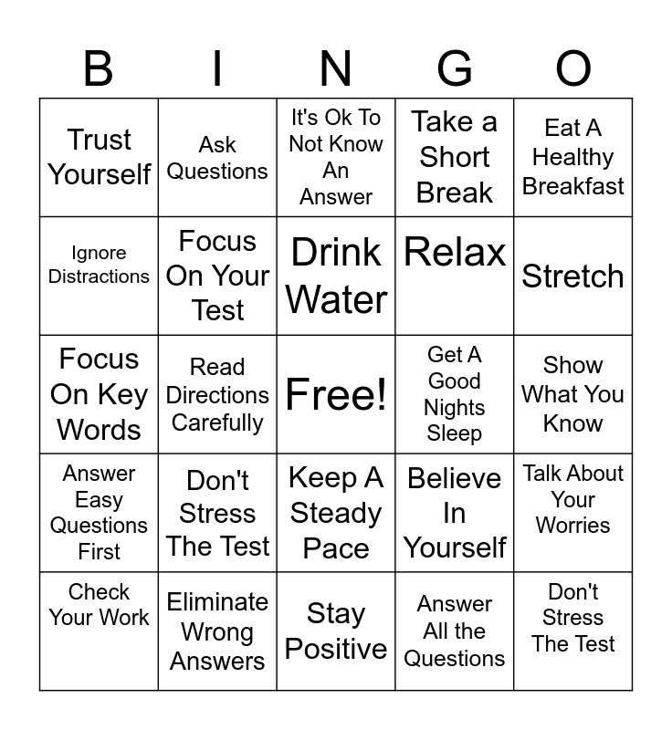 This bingo card has a free space and 24 words: Don't Stress The Test, Eliminate Wrong Answers, Drink Water, Check Your Work, Eat A Healthy Breakfast, Trust Yourself, Ignore Distractions, Ask Questions, Get A Good Nights Sleep, Keep A Steady Pace, Relax, Focus On Key Words, Believe In Yourself, Talk About Your Worries, Focus On Your Test, Answer All the Questions, Show What You Know, It's Ok To Not Know An Answer, Stretch, Read Directions Carefully, Don't Stress The Test, Answer Easy Questions First, Take a Short Break and Stay Positive.
