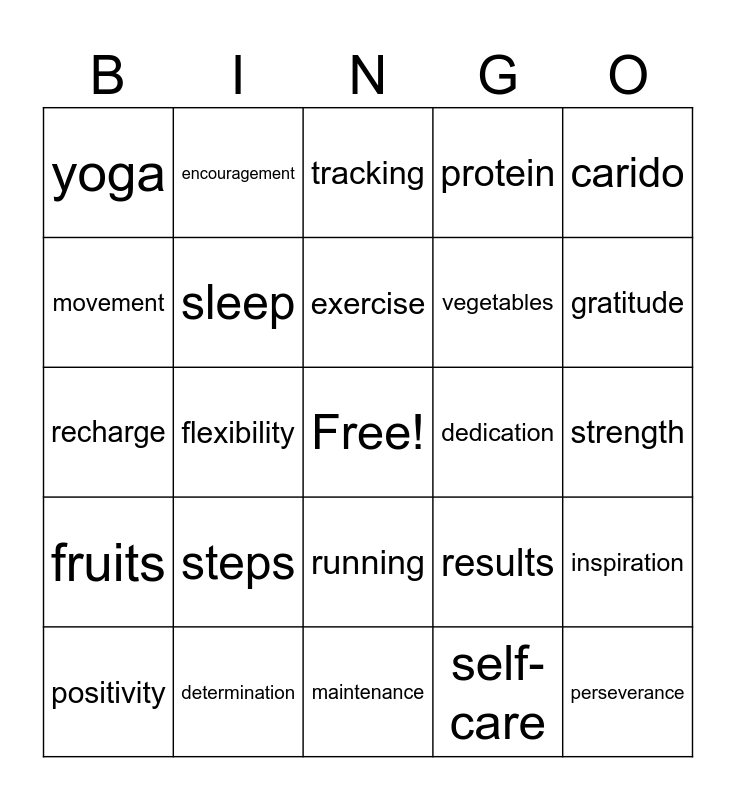 This bingo card has a free space and 64 words: support, accountability, friendship, inspiration, teamwork, motivation, encouragement, goals, exercise, walking, running, stretching, strength, carido, fitness, movement, flexibility, yoga, dance, vegetables, steps, fruits, protein, fiber, hydration, vitamins, water, energy, salad, healthy, snacks, mindfulness, choices, meditation, gratitude, positivity, journaling, self-care, rest, sleep, recharge, dedication, success, progress, focus, perseverance, determination, habits, results, routine, transformation, empowerment, maintenance, scale, calories, portions, tracking, consistency, awareness, sharing, together, belonging, success and KOPS.