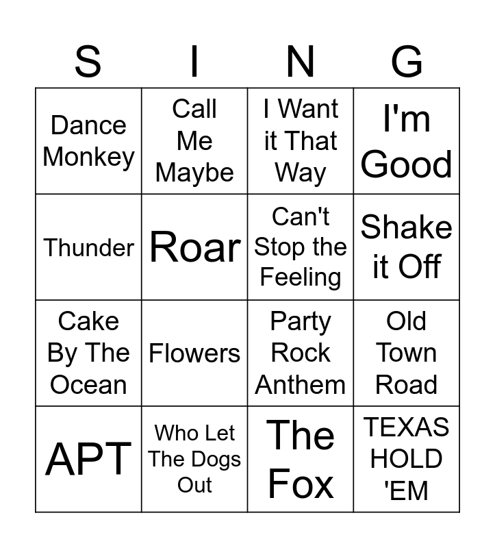 This bingo card has 24 words: Happy, Party In The USA, Shake it Off, Uptown Funk, Thunder, Dance Monkey, Roar, Call Me Maybe, Who Let The Dogs Out, Best Day of My Life, Cake By The Ocean, Party Rock Anthem, All About That Bass, Moves Like Jagger, Can't Stop the Feeling, Kings and Queens, The Fox, I Want it That Way, Flowers, Old Town Road, APT, TEXAS HOLD 'EM, I'm Good and Cheerleader.