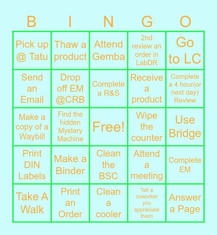 This bingo card has a free space and 24 words: Make a Binder, Print an Order, Complete a R&S, Take A Walk, Go to LC, Pick up @ Tatu, Send an Email, Thaw a product, Wipe the counter, Clean the BSC, Receive a product, Make a copy of a Waybill, Attend a meeting, Complete EM, Drop off EM @CRB, Tell a coworker you appreciate them, Use Bridge, Attend Gemba, Complete a 4 hour(or next day) Review, Find the hidden Mystery Machine, Answer a Page, Print DIN Labels, 2nd review an order in LabDR and Clean a cooler.