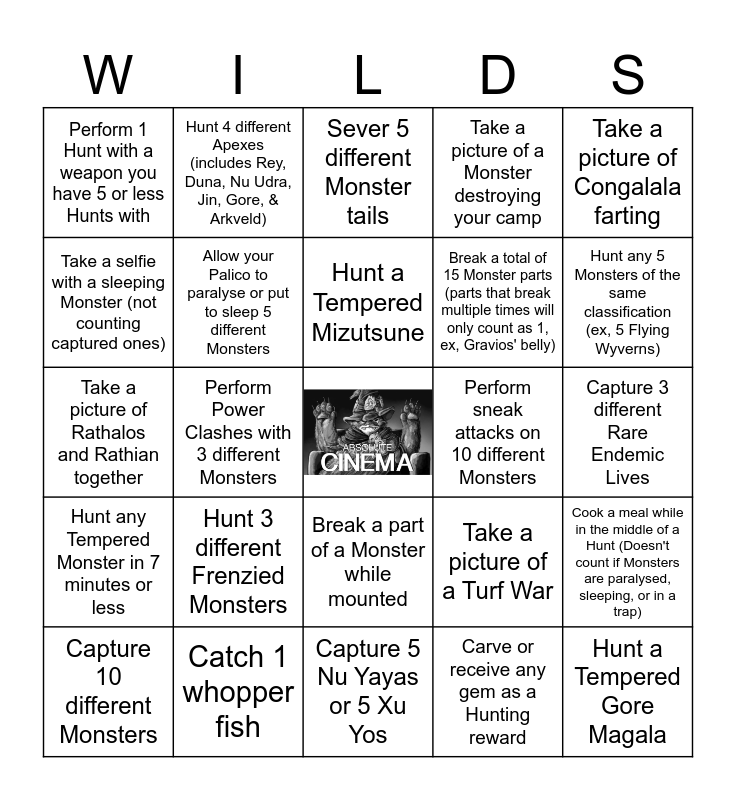This bingo card has a free space and 24 words: Hunt 3 different Frenzied Monsters, Catch 1 whopper fish, Hunt a Tempered Mizutsune, Capture 10 different Monsters, Take a picture of Congalala farting, Perform 1 Hunt with a weapon you have 5 or less Hunts with, Take a selfie with a sleeping Monster (not counting captured ones), Hunt 4 different Apexes (includes Rey, Duna, Nu Udra, Jin, Gore, & Arkveld), Perform sneak attacks on 10 different Monsters, Break a part of a Monster while mounted, Break a total of 15 Monster parts (parts that break multiple times will only count as 1, ex, Gravios' belly), Take a picture of Rathalos and Rathian together, Take a picture of a Turf War, Cook a meal while in the middle of a Hunt (Doesn't count if Monsters are paralysed, sleeping, or in a trap), Allow your Palico to paralyse or put to sleep 5 different Monsters, Carve or receive any gem as a Hunting reward, Capture 3 different Rare Endemic Lives, Sever 5 different Monster tails, Hunt any 5 Monsters of the same classification (ex, 5 Flying Wyverns), Perform Power Clashes with 3 different Monsters, Hunt a Tempered Gore Magala, Hunt any Tempered Monster in 7 minutes or less, Take a picture of a Monster destroying your camp and Capture 5 Nu Yayas or 5 Xu Yos.