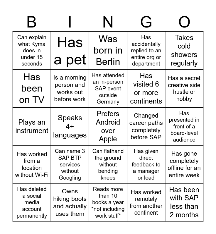 This bingo card has a free space and 24 words: Can name 3 SAP BTP services without Googling, Owns hiking boots and actually uses them, Has attended an in-person SAP event outside Germany, Has deleted a social media account permanently, Takes cold showers regularly, Can explain what Kyma does in under 15 seconds, Has been on TV, Has a pet, Changed career paths completely before SAP, Can flathand the ground without bending knees, Has visited 6 or more continents, Plays an instrument, Has given direct feedback to a manager or lead, Has gone completely offline for an entire week, Is a morning person and works out before work, Has worked remotely from another continent, Has presented in front of a board-level audience, Was born in Berlin, Has a secret creative side hustle or hobby, Speaks 4+ languages, Has been with SAP less than 2 months, Has worked from a location without Wi-Fi, Has accidentally replied to an entire org or department and Reads more than 10 books a year *not including work stuff*.