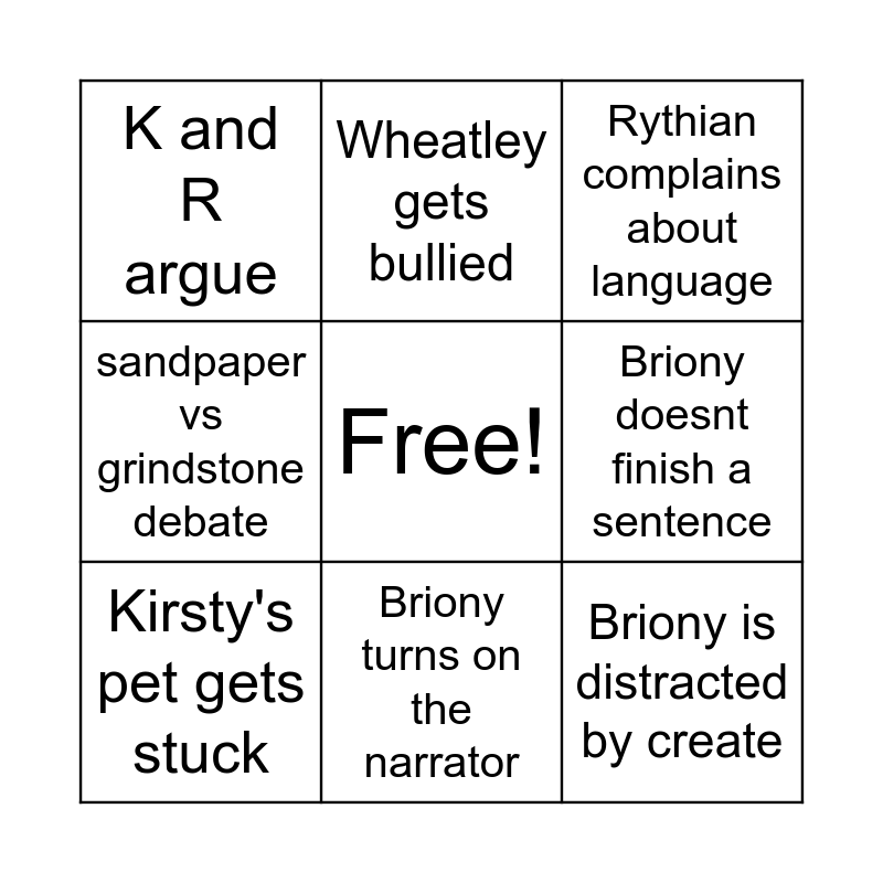 This bingo card has a free space and 8 words: Briony doesnt finish a sentence, Rythian complains about language, Wheatley gets bullied, Kirsty's pet gets stuck, K and R argue, Briony is distracted by create, sandpaper vs grindstone debate and Briony turns on the narrator.