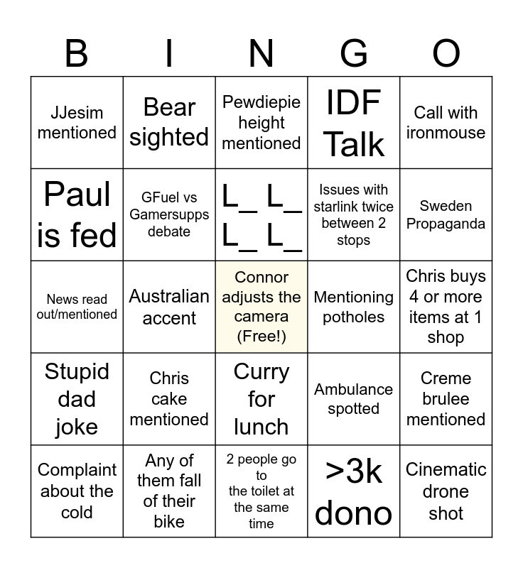 This bingo card has a free space and 24 words: Chris cake mentioned, Any of them fall of their bike, L_ L_ L_ L_, Complaint about the cold, Call with ironmouse, JJesim mentioned, Paul is fed, Bear sighted, Mentioning potholes, Curry for lunch, Issues with starlink twice between 2 stops, News read out/mentioned, Ambulance spotted, Creme brulee mentioned, GFuel vs Gamersupps debate, >3k dono, Chris buys 4 or more items at 1 shop, Pewdiepie height mentioned, Sweden Propaganda, Australian accent, Cinematic drone shot, Stupid dad joke, IDF Talk and 2 people go to the toilet at the same time.