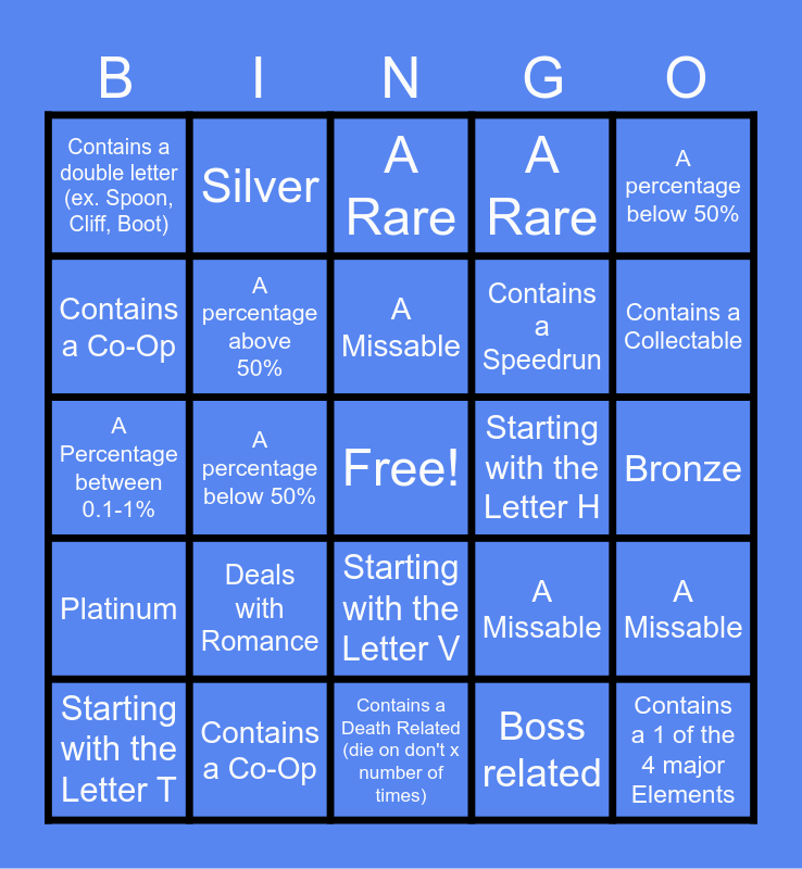 ⚠ This card has duplicate items: Contains an Animal (3), Contains a Skill (3), Contains a double letter (ex. Spoon, Cliff, Boot) (3), Contains a Body Part (3), Contains a Monster (3), Contains a Death Related (die on don't x number of times) (3), Contains a Speedrun (3), Difficulty Related (3), Contains a Food Item (3), Contains a Color (3), Contains a 1 of the 4 major Elements (3), A Common (4), An Uncommon (3), A Rare (2), Contains a Co-Op (6), Contains a Collectable (6), Level based (3), Boss related (3), Crafting related (3), A Missable (4), A percentage above 50% (3), A percentage below 50% (3), A Percentage between 0.1-1% (3), A Percentage between 1.1-10% (3), A Percentage between 10.1-50% (3), Get a trophy in a Classic game Catalogue (3), Bronze (4), Silver (3), Gold (2)