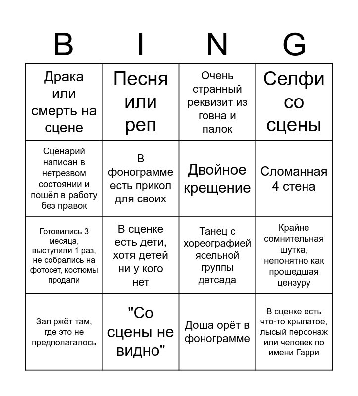 This bingo card has 16 words: "Со сцены не видно", Крайне сомнительная шутка, непонятно как прошедшая цензуру, Очень странный реквизит из говна и палок, Драка или смерть на сцене, Готовились 3 месяца, выступили 1 раз, не собрались на фотосет, костюмы продали, Песня или реп, Танец с хореографией ясельной группы детсада, Доша орёт в фонограмме, Сценарий написан в нетрезвом состоянии и пошёл в работу без правок, В фонограмме есть прикол для своих, Зал ржёт там, где это не предполагалось, Селфи со сцены, В сценке есть дети, хотя детей ни у кого нет, Сломанная 4 стена, Двойное крещение and В сценке есть что-то крылатое, лысый персонаж или человек по имени Гарри.