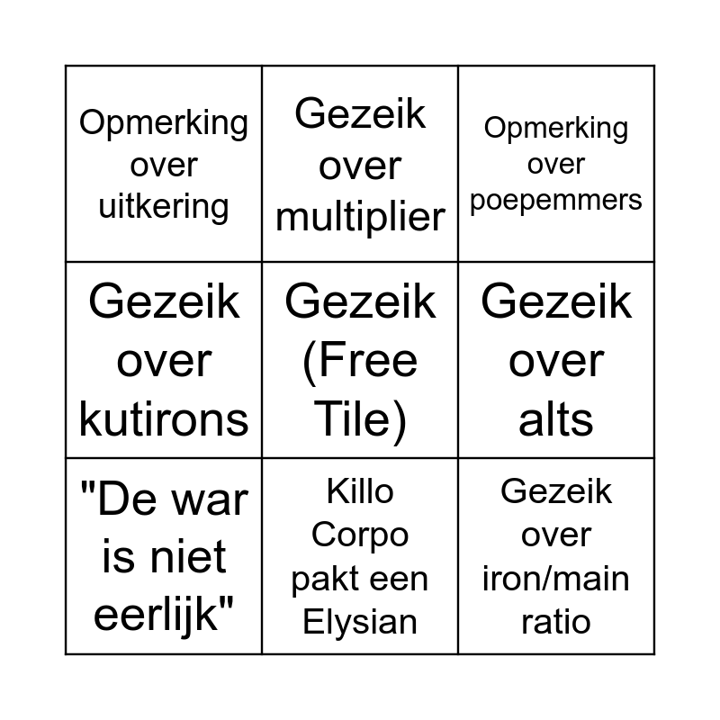 This bingo card has a free space and 8 words: Gezeik over kutirons, Gezeik over multiplier, Gezeik over alts, "De war is niet eerlijk", Opmerking over poepemmers, Opmerking over uitkering, Killo Corpo pakt een Elysian and Gezeik over iron/main ratio.