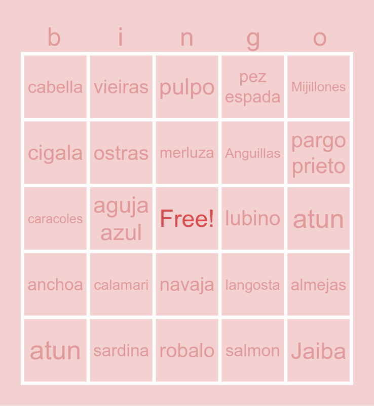 This bingo card has a free space and 24 words: atun, calamari, merluza, salmon, Mijillones, cabella, vieiras, pulpo, lubino, atun, caracoles, ostras, langosta, almejas, cigala, sardina, robalo, pez espada, pargo prieto, anchoa, aguja azul, navaja, Anguillas and Jaiba.