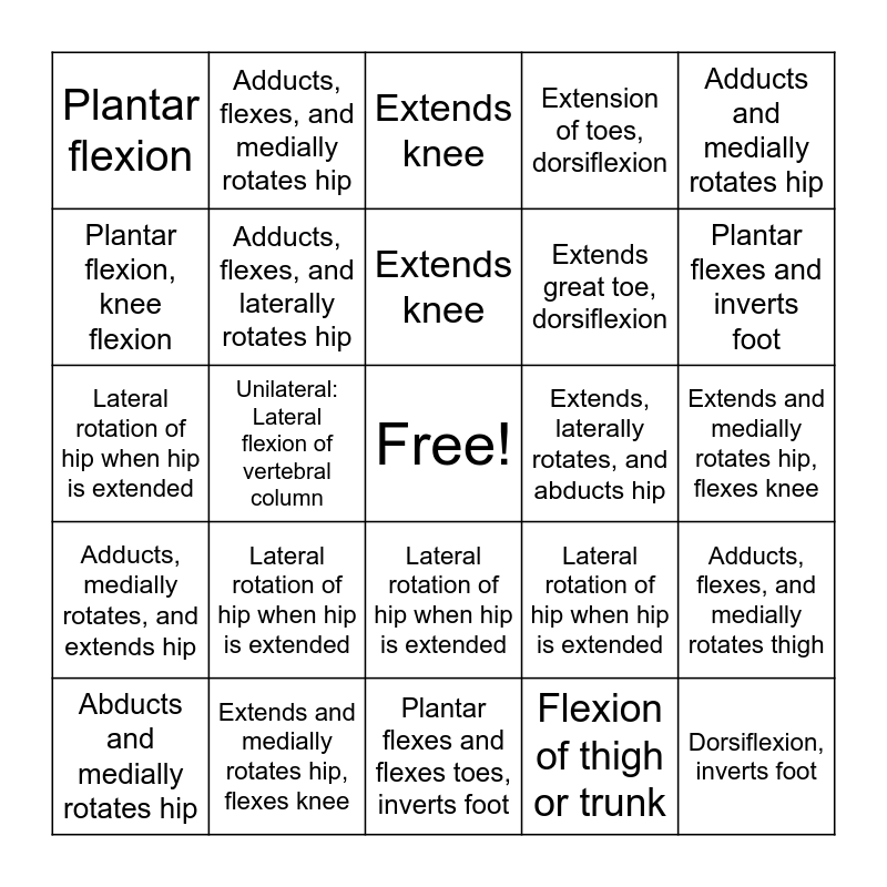 This bingo card has a free space and 32 words: Flexion of thigh or trunk, Bilateral: Flexion of thigh or trunk, Unilateral: Lateral flexion of vertebral column, Flexes, abducts, and laterally rotates thigh; knee flexion, Adducts, medially rotates, and extends hip, Adducts, flexes, and laterally rotates hip, Adducts and medially rotates hip, Adducts, flexes, and medially rotates thigh, Adducts, flexes, and medially rotates hip, Extends knee, flexes hip, Extends knee, Extends knee, Extends knee, Flexes and abducts hip, Extends, laterally rotates, and abducts hip, Abducts and medially rotates hip, Abducts and medially rotates hip, Lateral rotation of hip when hip is extended, Lateral rotation of hip when hip is extended, Lateral rotation of hip when hip is extended, Lateral rotation of hip when hip is extended, Extends and laterally rotates hip, flexes knee, Extends and medially rotates hip, flexes knee, Extends and medially rotates hip, flexes knee, Dorsiflexion, inverts foot, Extension of toes, dorsiflexion, Extends great toe, dorsiflexion, Plantar flexion, knee flexion, Plantar flexion, Plantar flexes and flexes toes, inverts foot, Plantar flexes and inverts foot, flexes great toe and Plantar flexes and inverts foot.