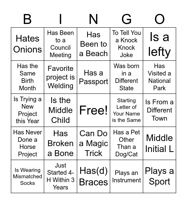 This bingo card has a free space and 38 words: Favorite Color Blue, Has a Sewing Project, Was a Cloverbud, Favorite project is Welding, Middle Initial L, Has Broken a Bone, Has a Passport, Does Cake Decorating, Is a lefty, Was born in a Different State, Is the Middle Child, To Tell You a Knock Knock Joke, Plays a Sport, Is From a Different Town, Has the Same Birth Month, Has Never Done a Horse Project, Likes Sushi, Has Been to a Beach, Is in the Same Project as You, Starting Letter of Your Name is the Same, Hates Onions, Just Started 4-H Within 3 Years, Has Visited a National Park, Is Wearing Mismatched Socks, Has More than 3 Siblings, Has(d) Braces, Works with Cloverbuds, Has Helped Plant a Garden, Is a Twin/Knows a Twin, Has Visited More than 3 States, Shares Your Favorite Color, Can Do a Magic Trick, Plays an Instrument, Has Been to a Council Meeting, Is afraid of Spiders/Snakes, Has a Pet Other Than a Dog/Cat, Is Trying a New Project this Year and Is a Teen Leader.