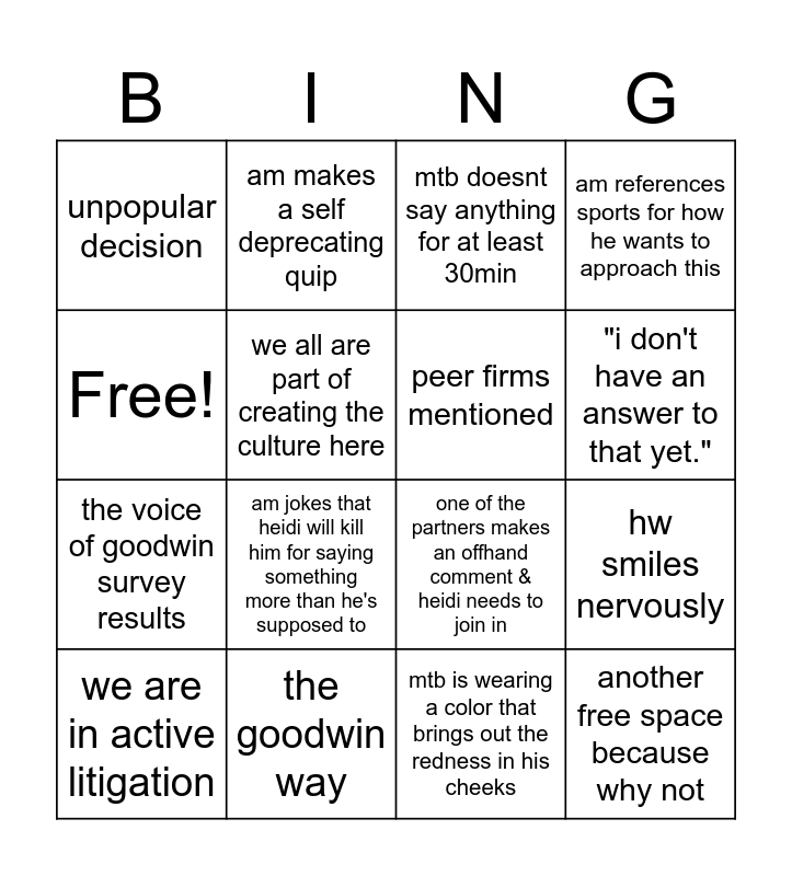 This bingo card has 16 words: the goodwin way, hw smiles nervously, mtb doesnt say anything for at least 30min, unpopular decision, the voice of goodwin survey results, am makes a self deprecating quip, one of the partners makes an offhand comment & heidi needs to join in, mtb is wearing a color that brings out the redness in his cheeks, Free!, we all are part of creating the culture here, we are in active litigation, am references sports for how he wants to approach this, am jokes that heidi will kill him for saying something more than he's supposed to, "i don't have an answer to that yet.", peer firms mentioned and another free space because why not.