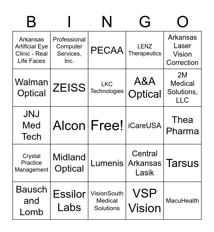 This bingo card has a free space and 42 words: Orasis Pharmaceuticals, Professional Computer Services, Inc., EssilorLuxottica / Eye Care, Central Arkansas Lasik, Thea Pharma, Bausch and Lomb, Midland Optical, Vision Care Direct, A&A Optical, 2M Medical Solutions, LLC, JNJ Med Tech, Alcon, VisionSouth Medical Solutions, iCareUSA, MacuHealth, Crystal Practice Management, CooperVision, LKC Technologies, SunPharma, Arkansas Laser Vision Correction, Walman Optical, rxotulsa, AbbVie, LENZ Therapeutics, Avulux, TruForm Optics, ZEISS, Topcon Healthcare, Europa Eyewear, Tarsus, Optos Inc, Essilor Labs, PECAA, VSP Vision, McFarland Eye Care, Marco Lombart, MODO, Lumenis, Essilor Instruments USA, Dompe, Arkansas Artificial Eye Clinic - Real Life Faces and Harvey & Bernice Jones Eye Institute.