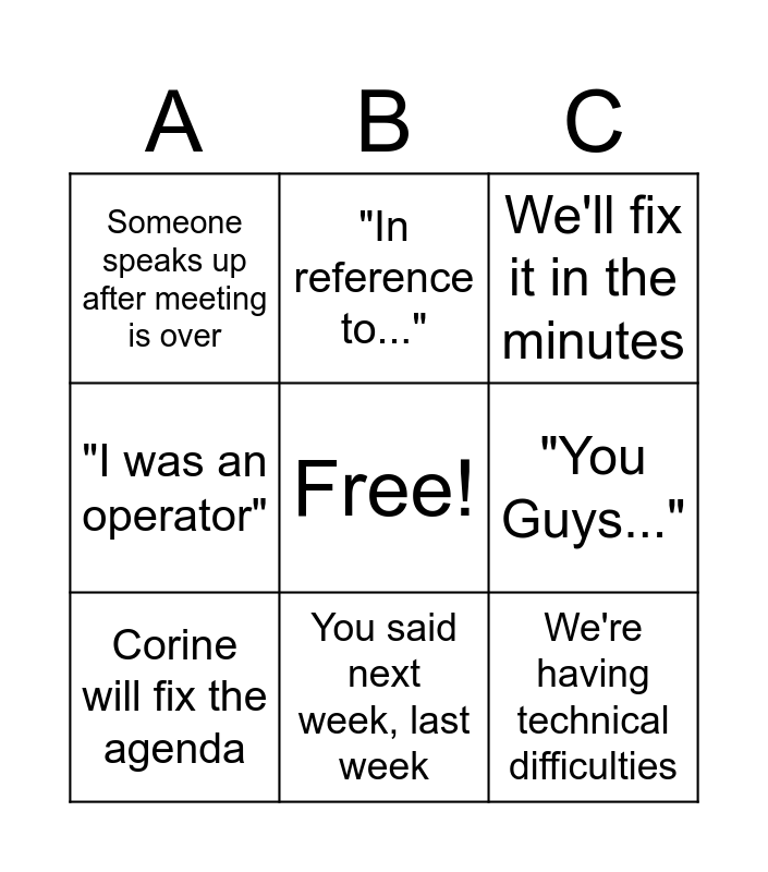 This bingo card has a free space and 8 words: "You Guys...", We'll fix it in the minutes, "In reference to...", Corine will fix the agenda, Someone speaks up after meeting is over, We're having technical difficulties, "I was an operator" and You said next week, last week.