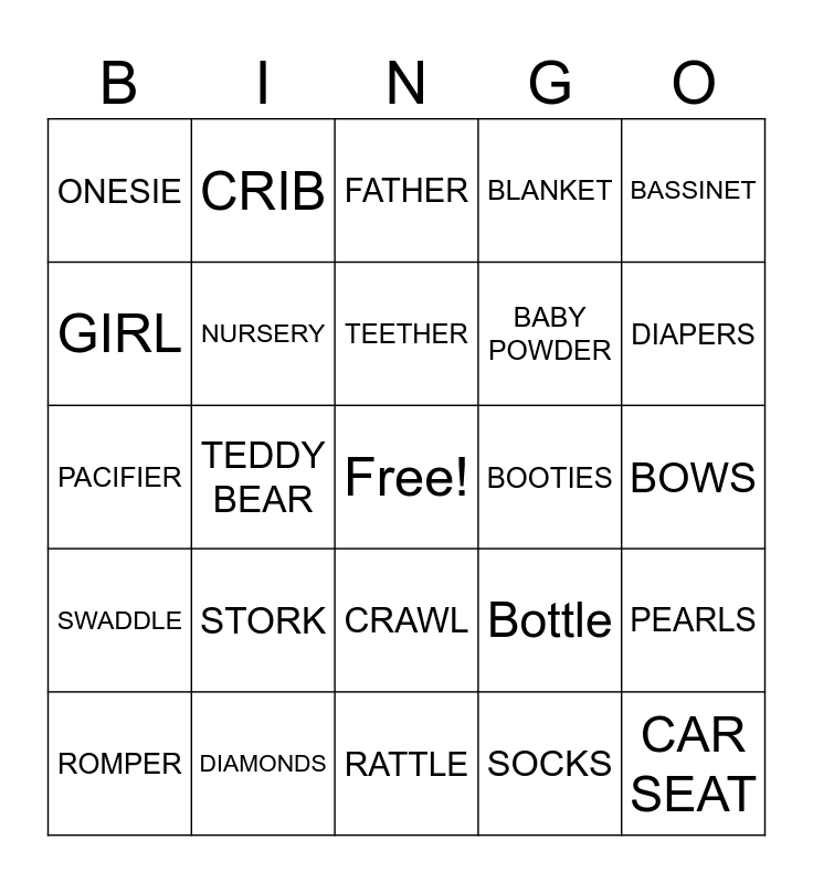 This bingo card has a free space and 36 words: BABY, STROLLER, Lullaby, NURSERY, Bottle, SWADDLE, TEETHER, STORY BOOK, BASSINET, SIPPY CUP, TEDDY BEAR, BLANKET, NIGHT LIGHT, BOOTIES, DIAPERS, ONESIE, MOTHER, STORK, CAR SEAT, FATHER, BOWS, PEARLS, DIAMONDS, ROMPER, RATTLE, CRIB, PACIFIER, BIB, BABY POWDER, GIRL, GRANDMOTHER, TOY, SOCKS, CRAWL, PARENTS and SLEEP.