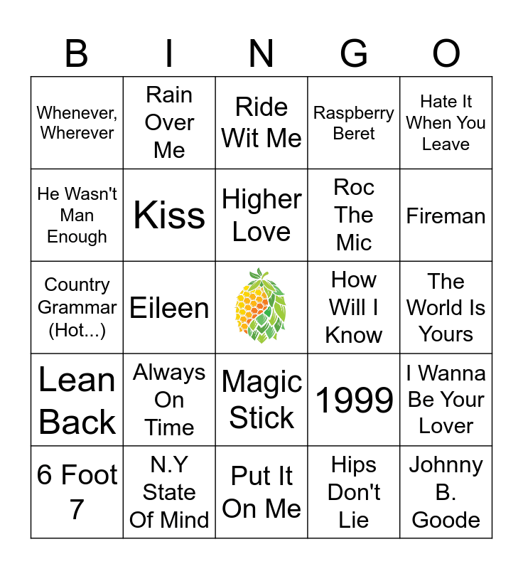 This bingo card has a free space and 47 words: Good Hearted Woman, Johnny B. Goode, You Never Can Tell, Put It On Me, Always On Time, Vivir Mi Vida, Rain Over Me, Da Rockwilder, He Wasn't Man Enough, You're Makin' Me High, Kiss, Raspberry Beret, I Wanna Be Your Lover, 1999, Maybellene, I Wanna Dance With Somebody (Who Loves Me), Higher Love, How Will I Know, Take It So Hard, Hate It When You Leave, Eileen, Hips Don't Lie, Whenever, Wherever, Roc The Mic, Shake It Fast, Fireman, 6 Foot 7, The Jump Off, Magic Stick, Lean Back, What's Luv?, Step Back, Low, Right Round, Wild Ones, N.Y State Of Mind, The World Is Yours, Black Widow, Fancy, Doo Wop (That Thing), Together, Ride Wit Me, Country Grammar (Hot...), U Can't Touch This, Ruff Ryders Anthem, X Gon' Give It To Ya and Na Na.