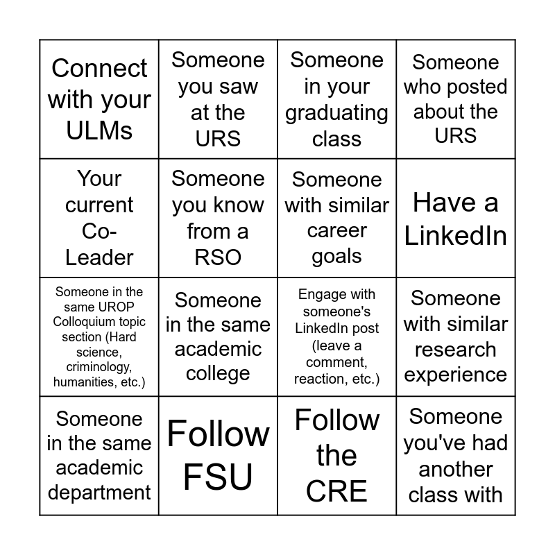 This bingo card has 16 words: Follow FSU, Someone with similar research experience, Someone in your graduating class, Connect with your ULMs, Someone in the same UROP Colloquium topic section (Hard science, criminology, humanities, etc.), Someone you saw at the URS, Engage with someone's LinkedIn post (leave a comment, reaction, etc.), Follow the CRE, Your current Co-Leader, Someone you know from a RSO, Someone in the same academic department, Someone who posted about the URS, Someone in the same academic college, Have a LinkedIn, Someone with similar career goals and Someone you've had another class with.