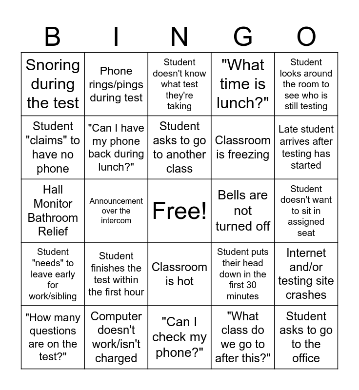 This bingo card has a free space and 24 words: Student finishes the test within the first hour, Computer doesn't work/isn't charged, Student asks to go to another class, "How many questions are on the test?", Student looks around the room to see who is still testing, Snoring during the test, Student "claims" to have no phone, Phone rings/pings during test, Bells are not turned off, Classroom is hot, Classroom is freezing, Hall Monitor Bathroom Relief, Student puts their head down in the first 30 minutes, Internet and/or testing site crashes, "Can I have my phone back during lunch?", "What class do we go to after this?", Student doesn't want to sit in assigned seat, Student doesn't know what test they're taking, Late student arrives after testing has started, Announcement over the intercom, Student asks to go to the office, Student "needs" to leave early for work/sibling, "What time is lunch?" and "Can I check my phone?".