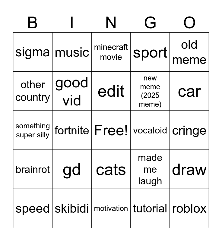 This bingo card has a free space and 24 words: gd, skibidi, edit, speed, old meme, sigma, other country, music, vocaloid, cats, new meme (2025 meme), something super silly, made me laugh, draw, good vid, tutorial, cringe, minecraft movie, car, fortnite, roblox, brainrot, sport and motivation.