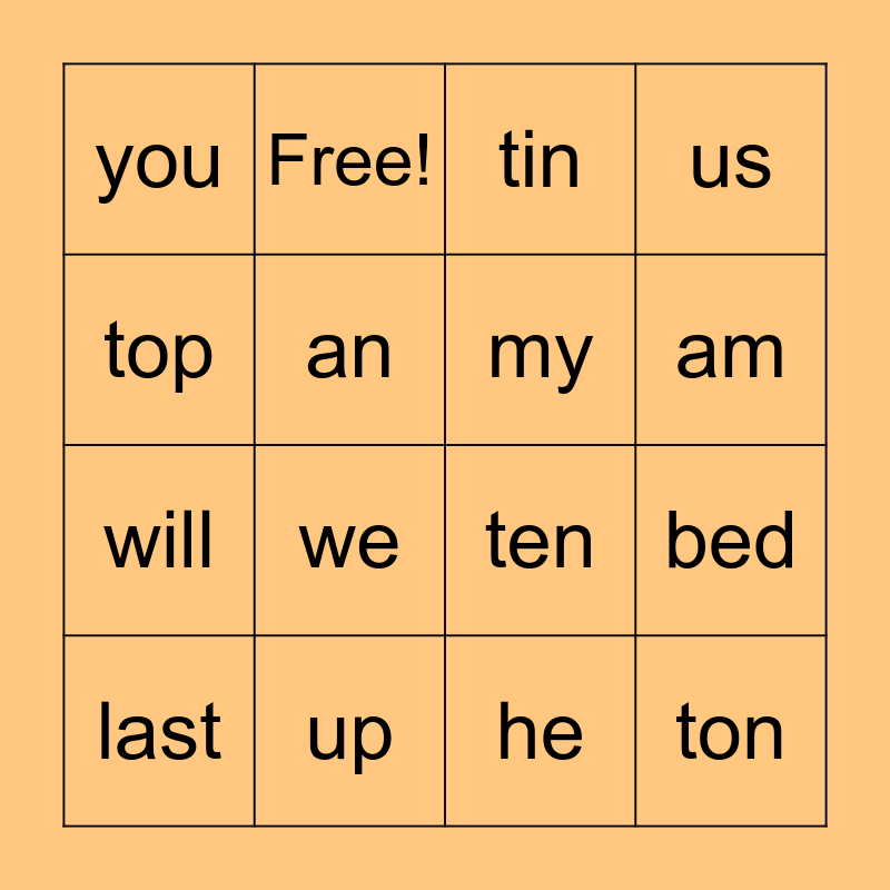 This bingo card has 19 words: ten, tan, tin, ton, bed, top, he, you, Free!, will, we, an, my, up, last, not, us, am and good.