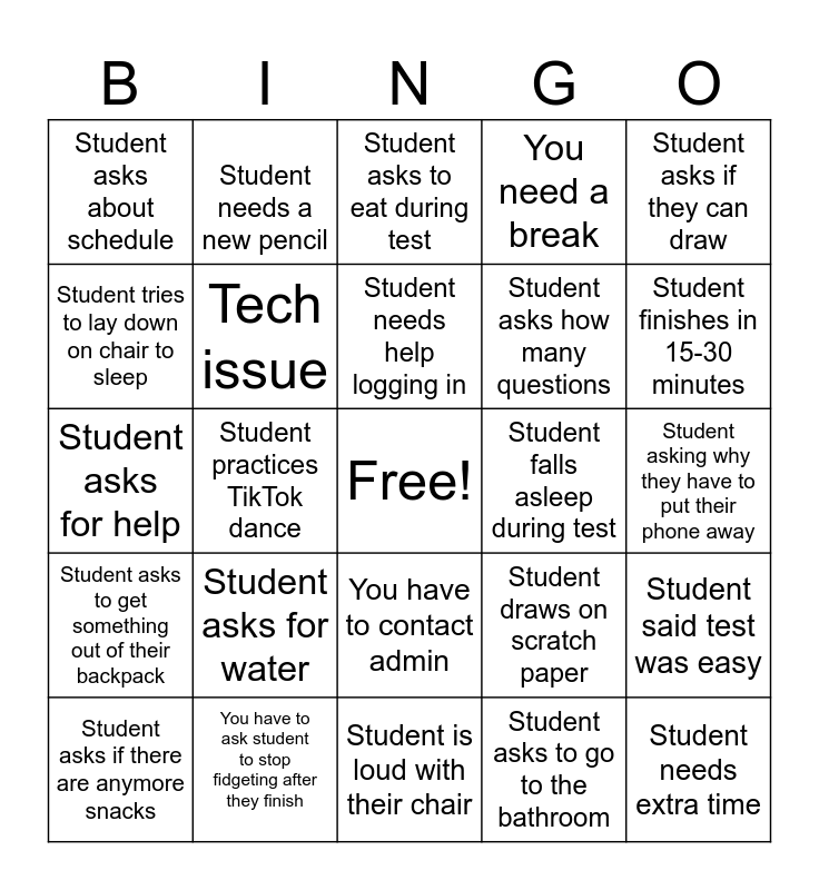 This bingo card has a free space and 24 words: Student asks for water, You have to ask student to stop fidgeting after they finish, Student needs help logging in, Student asks if there are anymore snacks, Student asks if they can draw, Student asks about schedule, Student tries to lay down on chair to sleep, Student needs a new pencil, Student falls asleep during test, You have to contact admin, Student asks how many questions, Student asks for help, Student draws on scratch paper, Student said test was easy, Tech issue, Student asks to go to the bathroom, Student asking why they have to put their phone away, Student asks to eat during test, Student finishes in 15-30 minutes, Student practices TikTok dance, Student needs extra time, Student asks to get something out of their backpack, You need a break and Student is loud with their chair.